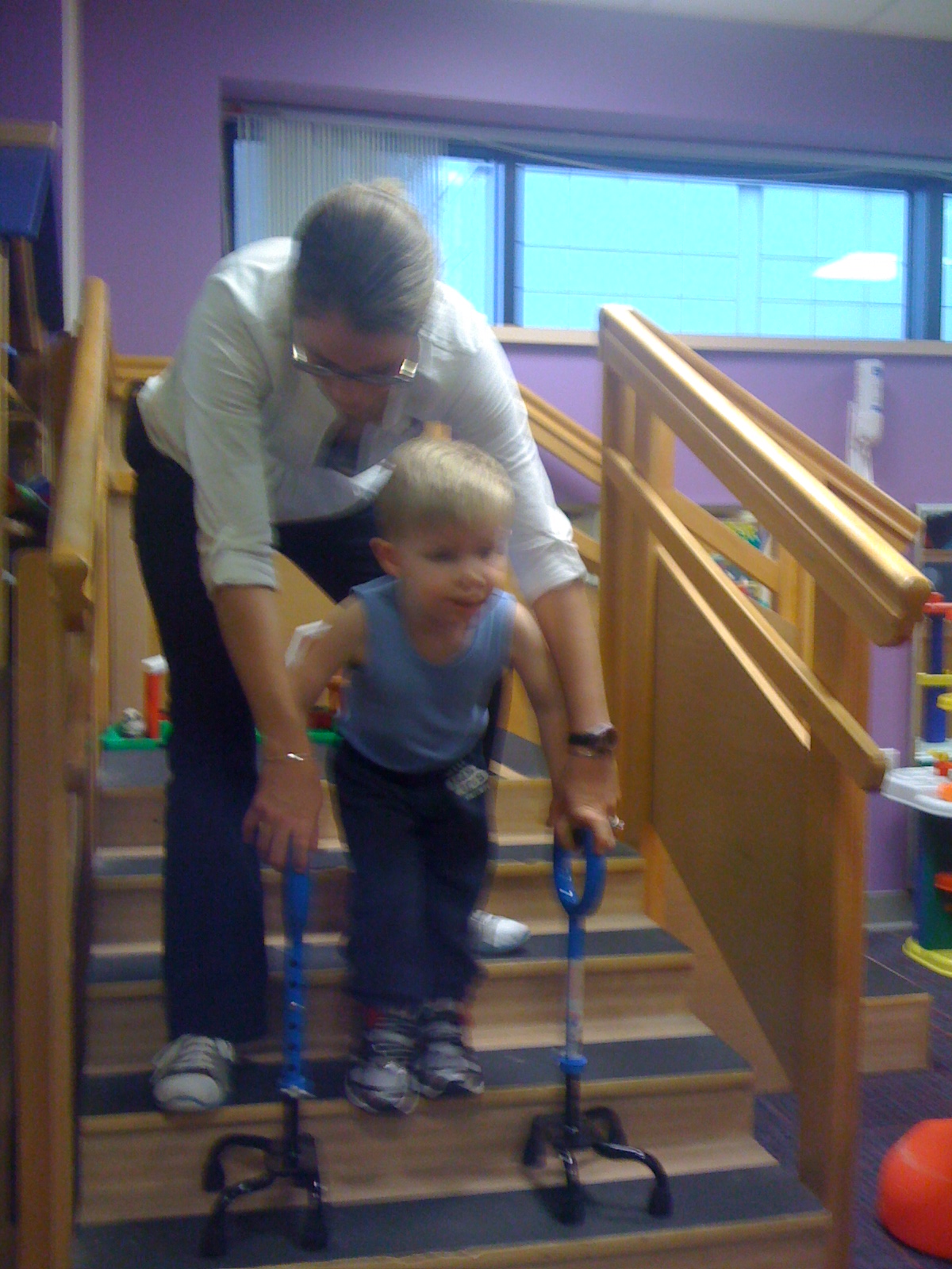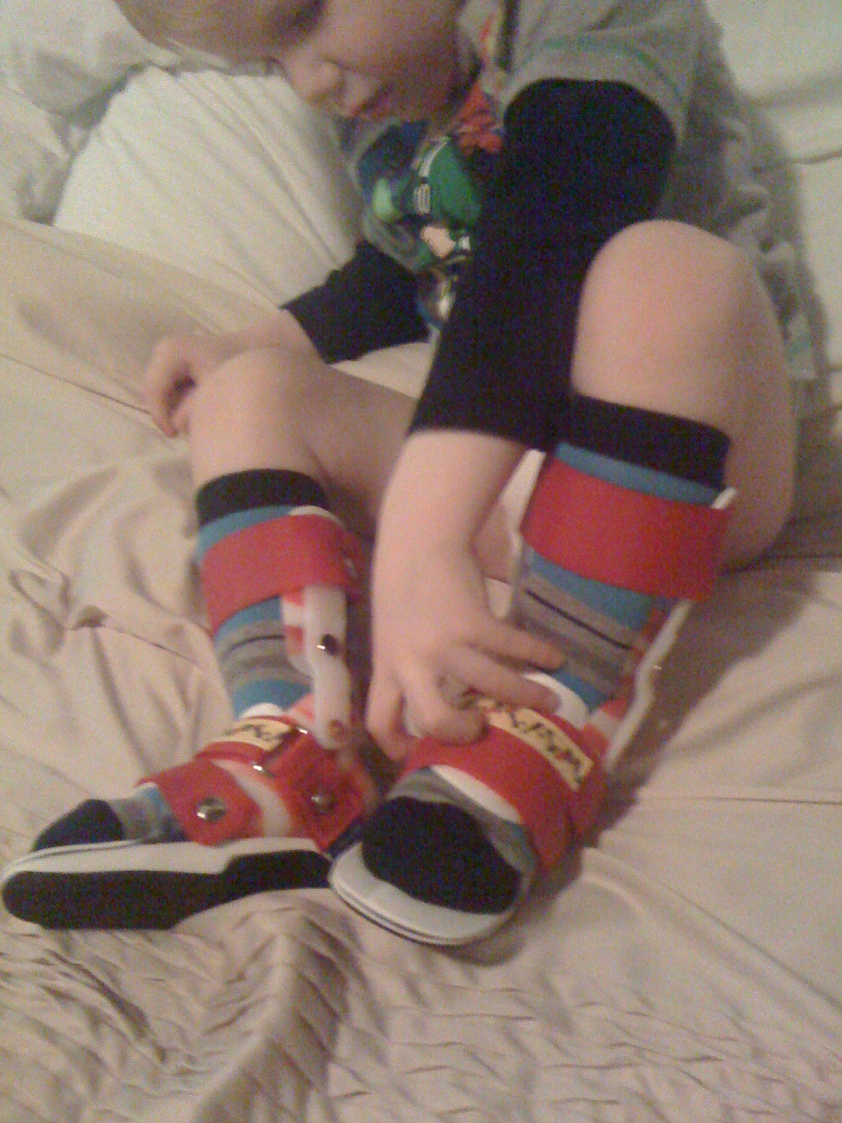 Today (Thursday) we walked over to the hospital and as I mentioned in Tuesday’s post it was to be today that Harry would have his leg’s and feet measured and to find out what the serial casting had achieved so as you can imagine we was a little nervous as yesterday was a significant day with the cast’s coming off and seeing those two lovely flat feet. Michael met us promptly and made a big fuss of Harry and his new trainer’s and Harry walked in on his frame with real purpose. Michael positioned Harry on the treatment table for the measuring and from that moment everything seemed to go wrong Harry struggled and was not happy again , Michael jotted down the result’s and then tried to placate a very upset Harry who just wanted to touch everything that he should not be touching the more Michael tried to appease him the worse he became. Blair came in to the room to look at the results and then Beth and then the new’s we had dreaded, although the casting’s had given Harry increased range in the ankle  they felt it would be best for Harry to go back in to cast’s until Monday at least. With us being told the complete opposite new’s that we wanted and the fact Harry was not doing what was being asked was too much for Shane and she blurted out something about Michael not being the ideal physio for Harry as Harry was not responding to his way’s and method’s like he did for Beth and Blair. I looked at Michael and he looked crushed his face told a story and it was the first time I had seen Michael look this way and I felt for him. Beth and Blair said it was up to us if we was to go ahead with the recasting and left us then Michael apologised to us for not being able to motivate Harry in to completing his task’s, with that Shane left the room in floods of tear’s she never wanted to hurt Michael’s feelings but felt she had done. I explained to Michael as I had done a few day’s ago that Harry is a sensitive little soul and has alway’s had female physiotherapist’s and just seem’s to respond better to female’s and it was his not his fault, Michael took what I said onboard but still looked upset. I know from what I have read and heard from other parent’s how good Michael really is he has a wacky over the top sense of humor and alway’s give’s 100 percent and his fellow work colleague’s hold him in high regard but with Harry it was not happening as we had hoped and when your time is precious you just want your child to flourish and we know when we return home the expertise that has been across the road from us will be many mile’s away. Laura from the Orthotic’s team came in to the room with Harry’s new splint’s two pair’s one for day’s and a set for night’s they are to be worn to maintain the heel cord stretch and hopefully prevent Harry from further surgery. Shane came back into the room with puffy eye’s and Michael managed to get Harry standing on a steep wedge to give his leg’s a stretch then Erica appeared and asked what were the result’s of her casting’s I told her and then said what Beth and Blair had suggested and  how we had been so elated yesterday and now so deflated today, she came up with an idea that Beth and Blair said was ok and that was for us to put Harry in to his splints straight away and use them until Monday and come back in to be measured and if this fails to give Harry the required range then he would have his leg’s recasted  later that day. At least it would give Harry some time off over the weekend with out the cumbersome cast’s but he will be wearing the fibreglass leg splint’s. Harry finished off on the total gym but was still unhappy and for the second day running I was glad to leave. We purchased a second pair of trainers to fit over Harry’s splints and Harry managed over four hour’s in them. It has not been one of our best day’s in St.louis but no one said it was going to be a walk in the park and I alway’s felt that we would have difficult day’s and this has been one but it’s how you deal with it and how you carry on, their might be tear’s of frustration from anyone of us but there are also tear’s of joy and I am sure the latter will prevail!!!!!!